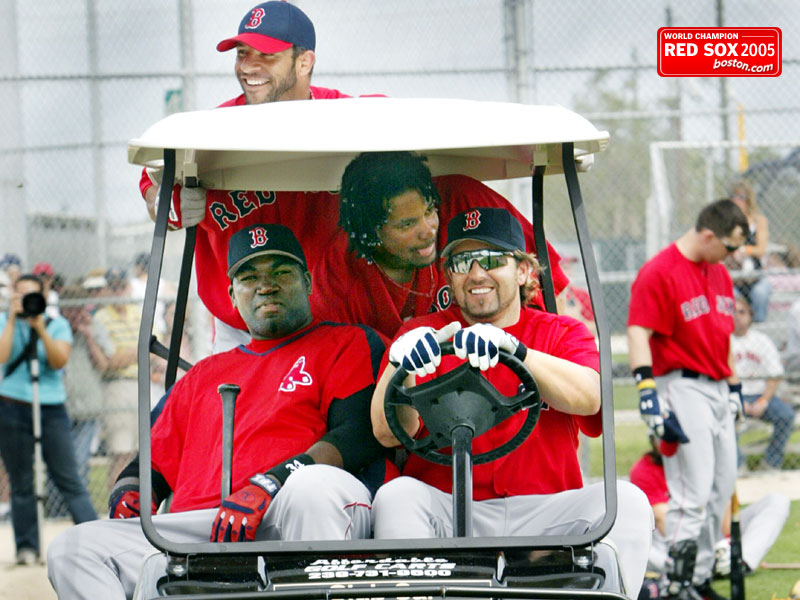 Not all is woe, however. Female Sox fans everywhere rejoice at the news that Jason Varitek has a younger brother who looks an awful lot like him. And everyone can smile at the sight of Kevin Millar stealing a golf cart*** and taking Ortiz, Manny, and newcomer Jay Payton for a joyride.